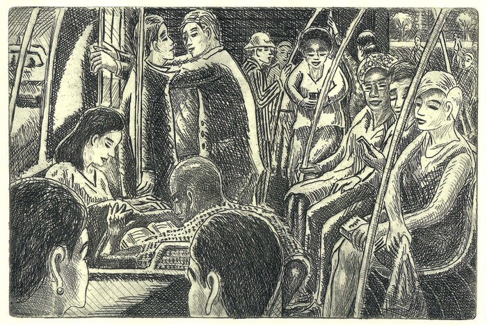 Etching developed from the artist's 2022 painting depicting a New York City bus, inspired by an on-the-spot sketch. Etching 5.95 x 8.85 inches. Includes a corner-doweled frame, archivally matted under plexiglass.